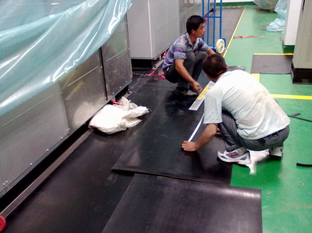絕緣膠墊本身有一定重量,有較好的抓地性,可以直接平鋪在地面上,一般無需膠水固定;接縫處可用壁紙刀切成斜度45°的切口,對(duì)齊拼接后可保證無明顯縫隙,不影響美觀及絕緣膠墊正常使用,如對(duì)外觀要求嚴(yán)格可用焊連接。低壓配電室配電柜前后鋪設(shè)即可。
